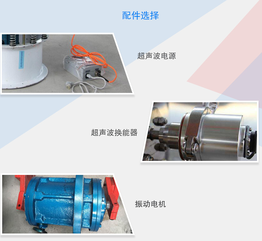 超聲波振動篩主要配件有:超聲波電源、超聲波換能器、振動電機。選擇不同質量或種類的配件對于超聲波振動篩使用效果都有著十分重要的作用。舉例來說,大漢超聲波振動篩的電機可以選擇普通或者是防爆性能的電機,防爆電機一般用于粉塵量大的場合,可以避免發生粉塵爆炸,其價格會比普通電機貴,一般篩分環境選擇旋振普通電機即可。