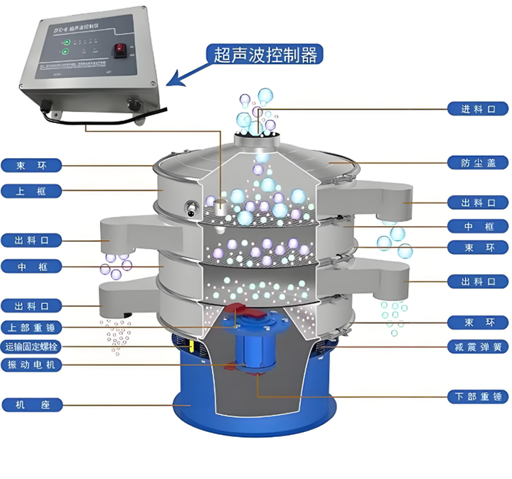 超聲波振動(dòng)篩廠家生產(chǎn)的通用結(jié)構(gòu)是振動(dòng)源、篩箱、篩網(wǎng)、超聲波系統(tǒng)及減震裝置等。振動(dòng)源為物料輸送供能;篩箱是物料篩分核心空間,內(nèi)部裝有200目或500目等不同目數(shù)的篩網(wǎng),篩網(wǎng)通過(guò)專(zhuān)用張緊裝置固定以保穩(wěn)定;超聲波系統(tǒng)含超聲波發(fā)生器和換能器,換能器可破物料團(tuán)聚、防堵網(wǎng);減震裝置裝于設(shè)備底部,能吸收設(shè)備運(yùn)行振動(dòng),減少對(duì)地面及周邊設(shè)備影響,同時(shí)保障設(shè)備穩(wěn)定運(yùn)行。我廠的超聲波發(fā)生器分為內(nèi)置式和外置式,并且我廠的超聲波振動(dòng)篩有法蘭式,能夠使物料輸送無(wú)泄漏。
