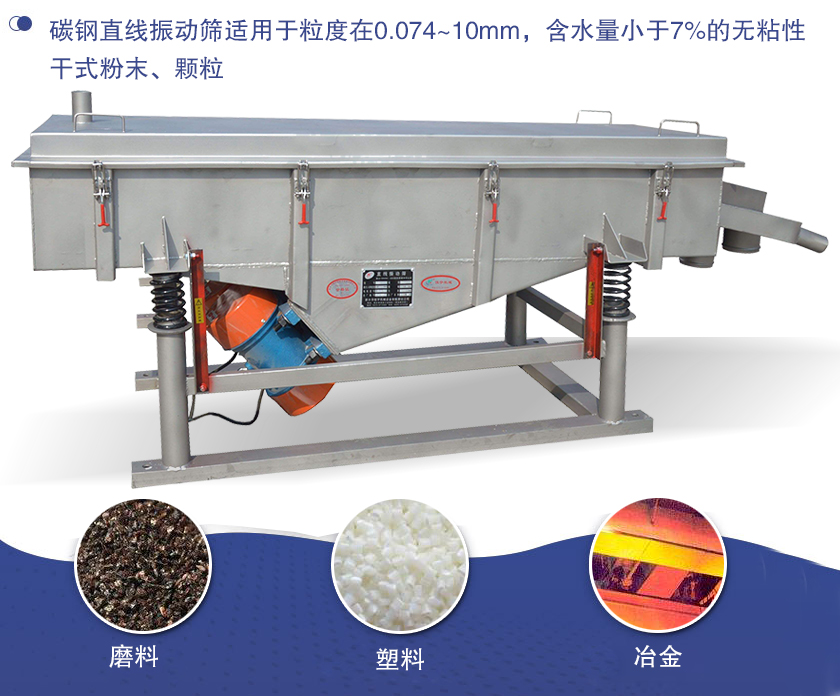 碳鋼直線振動篩適用于粒度在0.074~10mm,含水量小于7%的無粘性干式粉末、顆粒,主要用于磨料、化工、塑料、陶瓷、冶金、建材、糧食及化肥行業。