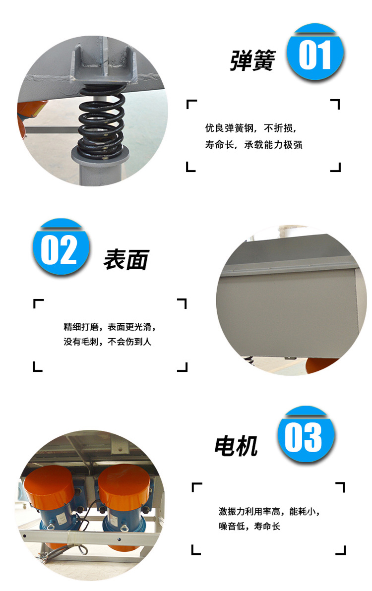 碳鋼直線振動篩主要由篩箱、篩框、篩網、振動電機、電機臺座、減振彈簧、支架等組成。